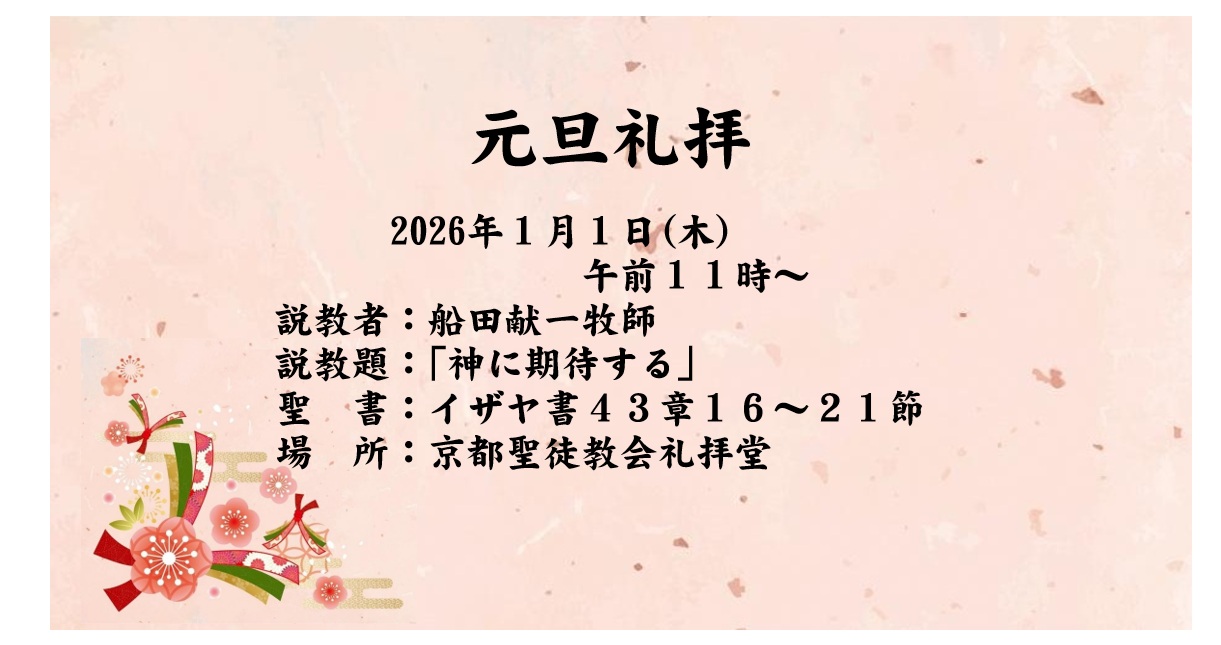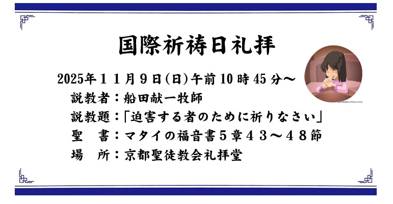 | 早朝礼拝 | 日曜 7:00~8:00 | 3階 礼拝堂 | 日曜日の早朝に約1時間行っています。 主に仕事の都合などで主日礼拝に出席できない方 が集っています。内容は主日礼拝と同じです。 |